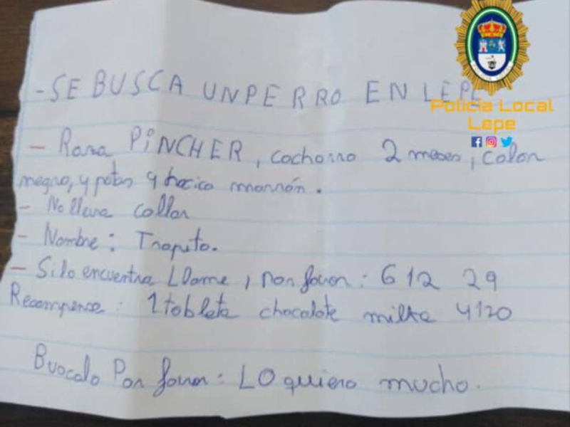 Podría ser otro llamamiento más, pero la carta, escrita a mano, ofrece una tierna recompensa: “Una tableta de Chocolate Milka”. "Nos conmueve este llamamiento que hace un vecino muy joven de nuestra ciudad, el cual ha perdido a su mascota y ofrece una suculenta “recompensa” por su localización. Nos sumamos a la búsqueda de “Trapito”, un pincher de apenas dos meses de edad. Vamos a ayudarle, no por la recompensa en si, sino por la ilusión de tenerlo de nuevo a su lado", escribía la Policía Local.