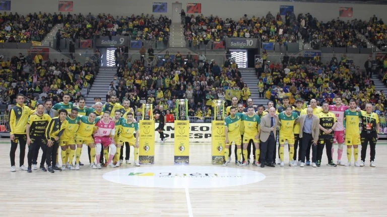 En la tarde del sábado nadie se quiso perder la gran fiesta del fútbol sala en el Olivo Arena. Volvía la 1ª Federación Futsal con el partido correspondiente a la jornada veinte, entre Jaén Paraíso Interior FS y Aspil -Jumpers Ribera Navarra FS. Ante más de cinco mil aficionados amarillos, entró Alan Brandi en pista portando la Copa de España, seguido del resto del equipo y del cuerpo técnico. Ofreció el capitán el trofeo a toda la Marea Amarilla que ovacionó emocionada recordando lo vivido en Granada el pasado fin de semana.