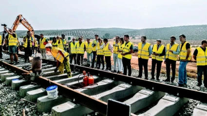 Las obras del ramal ferroviario entre Linares y Vadollano, que acomete la Junta de Andalucía, entran en su recta final con el inicio de la colocación de los carriles de vía en la plataforma. El consejero de Fomento y Vivienda, Felipe López, ha visitado hoy los trabajos que se llevan a cabo en esta actuación, enfocada al transporte por tren de mercancías entre el parque industrial y la red ferroviaria estatal, y que presenta ya un nivel de ejecución superior al 90%. El futuro ramal para transporte férreo de mercancías consta de una longitud de 6,5 kilómetros, que se inicia en el parque empresarial de Linares y concluya en la estación de ferrocarril de Vadollano, si bien su último tramo final, dentro de la zona de ADIF, titular de la estación, así como su adaptación, mediante el cambio de enclavamientos locales de la línea férrea estatal, será objeto de otra licitación. Las obras actuales, que concluyen justo en el vallado de ADIF que rodea el perímetro de la estación de ferrocarril de Vadollano, tienen un presupuesto vigente de 22,62 millones de euros.