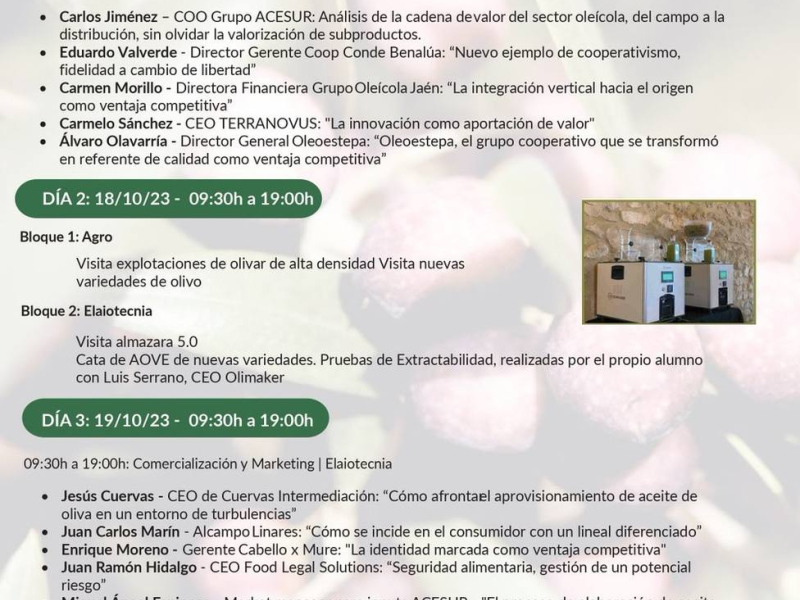 En cuanto a la dirección del curso, este estuvo a cargo de la catedrática María Jesús Hernández y el profesor Juan Vilar. Los principales objetivos del curso incluyeron el análisis de la dirección de empresas oleícolas a través de expertos del sector, la exposición de hitos clave para aumentar los ingresos netos en la cadena de valor oleícola, la propuesta de estrategias competitivas y la optimización de los recursos disponibles para promover la sostenibilidad en la producción de aceite de oliva.