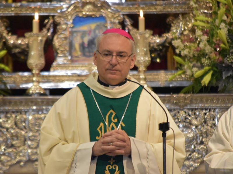 Recién llegado de Roma, donde ha participado en una peregrinación diocesana, llegaba hasta el templo Monseñor Chico Martínez, quien, acompañado del párroco, D. Pedro Montesinos; el Rector del Santuario, el Padre Alaminos; su secretario, D. Francisco Javier Cova y de los dos diáconos permanentes de la localidad, han concelebrado la celebración.