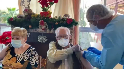 Antonio y Encarnación de 90 y 74 años respectivamente, dos mayores del Geriatrico de Linares, han sido los primeros que han recibido la vacuna contra la covid de la marca Pfizer este domingo en Jaén, después de que la comunidad haya recibido las primeras 1.840 dosis, de las cuales, en principio, 180 unidades serán para residentes y trabajadores del citado Geriátrico.