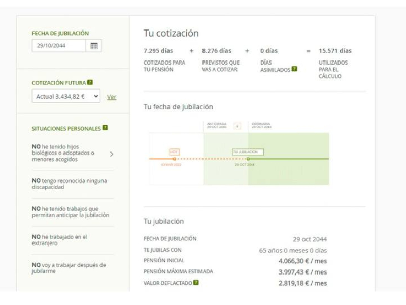 Si deseas conocer una estimación de la que será tu futura pensión de jubilación tan solo tendrás que pinchar sobre simular tu jubilación. Este simulador está actualizado y contempla las últimas modificaciones legales introducidas en la Ley 21/2021, de 28 de diciembre, de garantía del poder adquisitivo de las pensiones y de otras medidas de refuerzo de la sostenibilidad financiera y social del sistema público de pensiones.