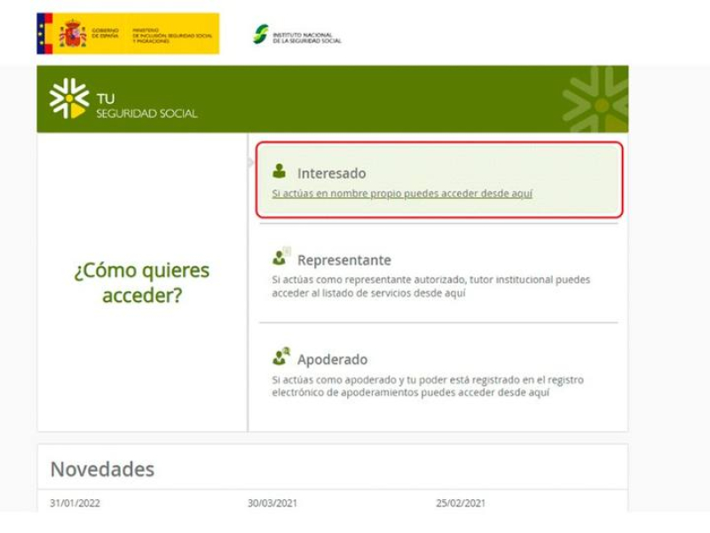 Para acceder a este servicio, en el caso del portal Tu Seguridad Social, selecciona si quieres acceder como interesado (en tu nombre) o bien como representante o autorizado de otra persona.