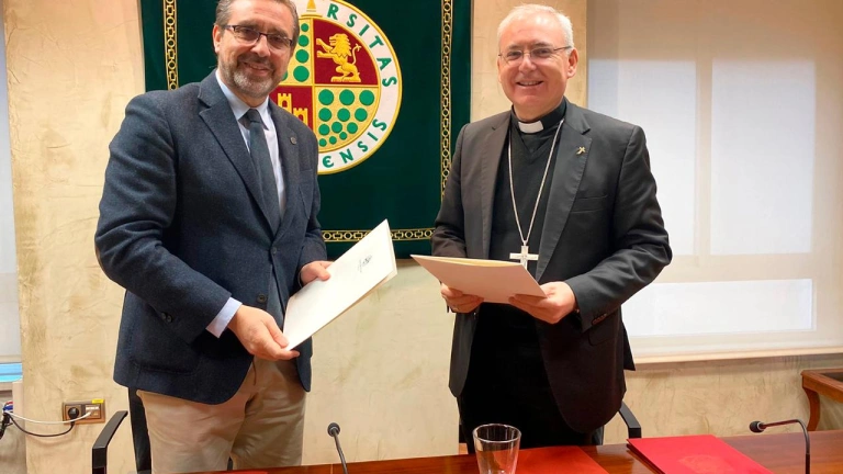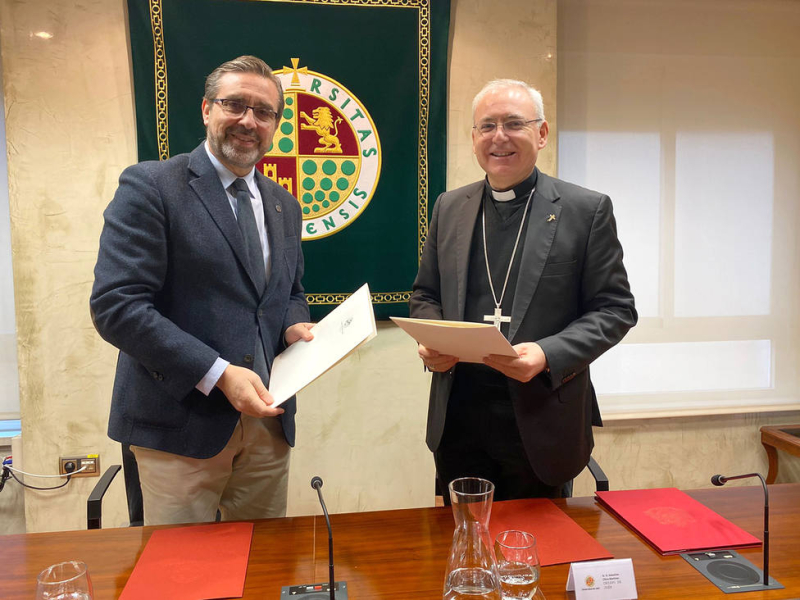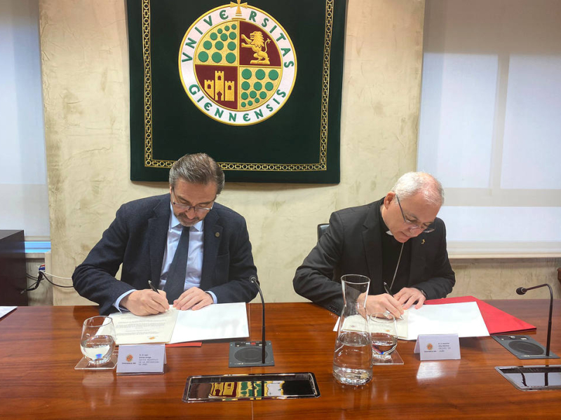 La Universidad de Jaén ha acogido la firma de un convenio entre la institución académica y el Obispado, rubricado por el Rector, D. Juan Gómez Ortega y el Obispo de Jaén, D. Sebastián Chico Martínez en el Aula Institucional del Rectorado.