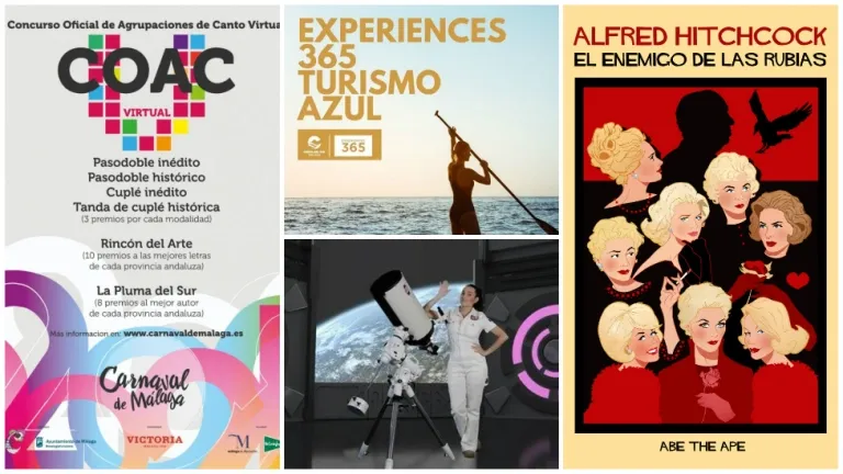 Cómo apuntarte al carnaval virtual, Turismo Azul en la Costa del Sol con Margarita del Cid, un programa de tele para aprender programación y el libro sobre Hitchcock de Abe The Ape