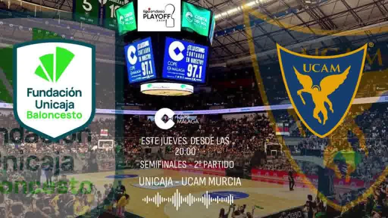 El partido Unicaja y UCAM Murcia lo podrás seguir desde las 20:00 h con la narración de Emilio Guerrero, los comentarios de Juan Carlos Bonilla, Anicet Lavodrama y la animación de Enrique Ortiz en el Tiempo de Juego de COPE MÁS Málaga en el 97.1 FM/ 882 AM y desde cualquier lugar a través de la web de COPE Málaga y en las aplicaciones de COPE y Tiempo de Juego seleccionando la emisora de COPE MÁS Málaga.