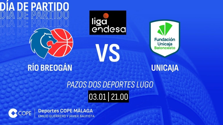 El partido Breogan - Unicaja lo podrás seguir desde las 20:30 horas con la narración de Javier Bautista, el control técnico de Javier Campos y los comentarios técnicos de Anicet Lavodrama y Juan Carlos Bonilla en el Tiempo de Juego de COPE MÁS Málaga en los diales 97.1 FM - 882 AM y desde cualquier lugar a través de la web de COPE Málaga y en las aplicaciones de COPE y Tiempo de Juego seleccionando la emisora de COPE MÁS Málaga.
