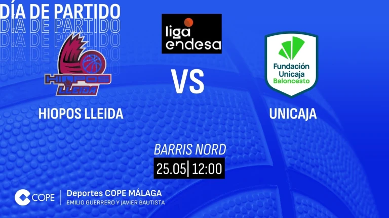 El partido entre Hiopos Lleida y Unicaja, lo podrás seguir desde las 12:00 h con la narración de Emilio Guerrero y los comentarios de Juan Carlos Bonilla y Anicet Lavodrama y la animación de Andrés Atienza en el Tiempo de Juego de COPE MÁS Málaga en el 97.1 FM/ 882 AM y desde cualquier lugar a través de la web de COPE Málaga y en las aplicaciones de COPE y Tiempo de Juego seleccionando la emisora de COPE MÁS Málaga.