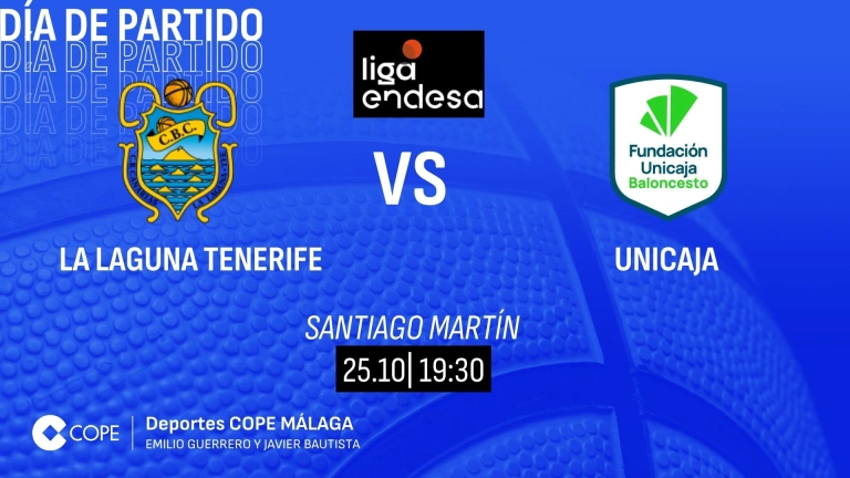 El partido entre La Laguna Tenerife y Unicaja, lo podrás seguir desde las 19:30 h con la narración de Emilio Guerrero y los comentarios de Anicet Lavodrama y Juan Carlos Bonilla y la animación de Enrique Ortiz en el Tiempo de Juego de COPE MÁS Málaga en el 97.1 FM/ 882 AM y desde cualquier lugar a través de la web de COPE Málaga y en las aplicaciones de COPE y Tiempo de Juego seleccionando la emisora de COPE MÁS Málaga.