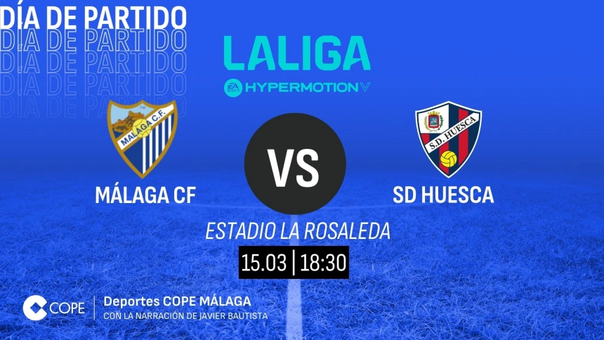 El partido Málaga - Huesca lo podrás seguir desde las 18:00 horas con la narración de Javier Bautista, la animación de Pedro González y los comentarios técnicos de Sergio Koke, exjugador del Málaga, en el Tiempo de Juego TOTAL de COPE MÁS Málaga y desde cualquier lugar a través de la web de COPE Málaga y en las aplicaciones de COPE y Tiempo de Juego seleccionando la emisora de COPE MÁS Málaga.