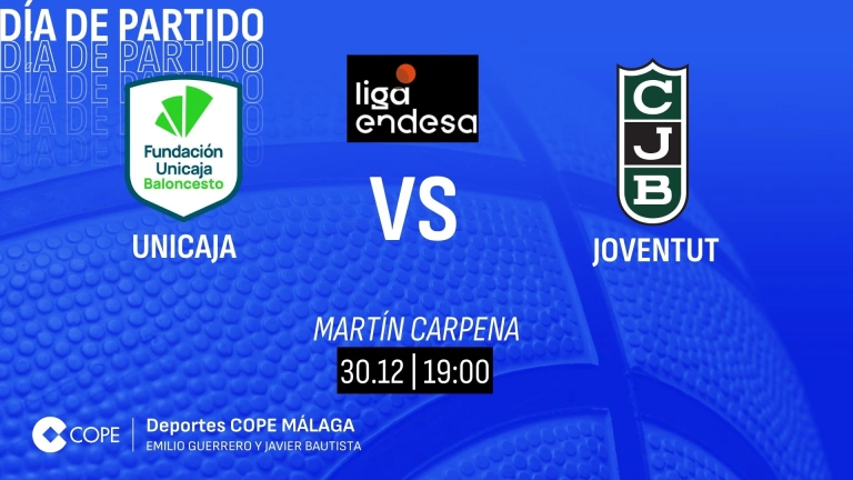 El partido Unicaja – Joventut de Badalona lo podrás seguir desde las 18:30 horas con la narración de Javier Bautista, la animación de Enrique Ortíz y los comentarios de Juan Carlos Bonilla y Anicet Lavodrama en el Tiempo de Juego TOTAL de COPE MÁS Málaga y desde cualquier lugar a través de la web de COPE Málaga y en las aplicaciones de COPE y Tiempo de Juego seleccionando la emisora de COPE MÁS Málaga.