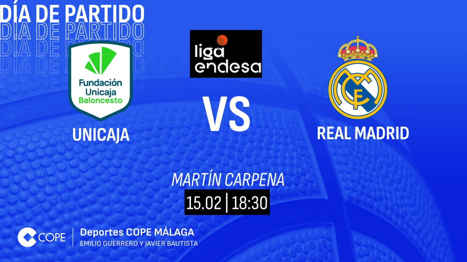 El partido Unicaja - Real Madrid lo podrás seguir desde las 18:30 horas con la narración de Emilio Guerrero, la animación de Enrique Ortiz y los comentarios técnicos de Anicet Lavodrama y Pablo García en el Tiempo de Juego de COPE MÁS Málaga en los diales 97.1 FM - 882 AM y desde cualquier lugar a través de la web de COPE Málaga y en las aplicaciones de COPE y Tiempo de Juego seleccionando la emisora de COPE MÁS Málaga