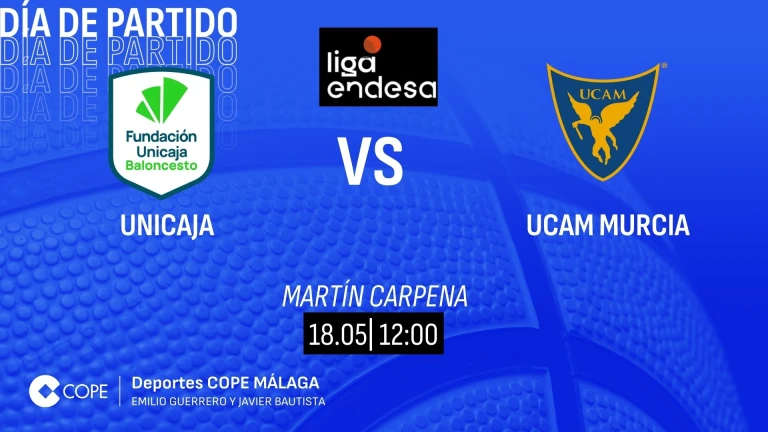 El partido entre Unicaja y UCAM Murcia, lo podrás seguir desde las 12:00 h con la narración de Emilio Guerrero y los comentarios de Juan Carlos Bonilla y Anicet Lavodrama y la animación de Enrique Ortiz en el Tiempo de Juego de COPE MÁS Málaga en el 97.1 FM/ 882 AM y desde cualquier lugar a través de la web de COPE Málaga y en las aplicaciones de COPE y Tiempo de Juego seleccionando la emisora de COPE MÁS Málaga.