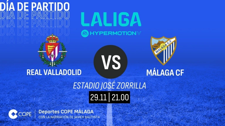El partido Valladolid - Málaga lo podrás seguir desde las 20:30 horas con la narración de Javier Bautista, el control técnico de Javier Campos y los comentarios técnicos de Bori Moreno en el Tiempo de Juego de COPE MÁS Málaga en los diales 97.1 FM - 882 AM y desde cualquier lugar a través de la web de COPE Málaga y en las aplicaciones de COPE y Tiempo de Juego seleccionando la emisora de COPE MÁS Málaga.