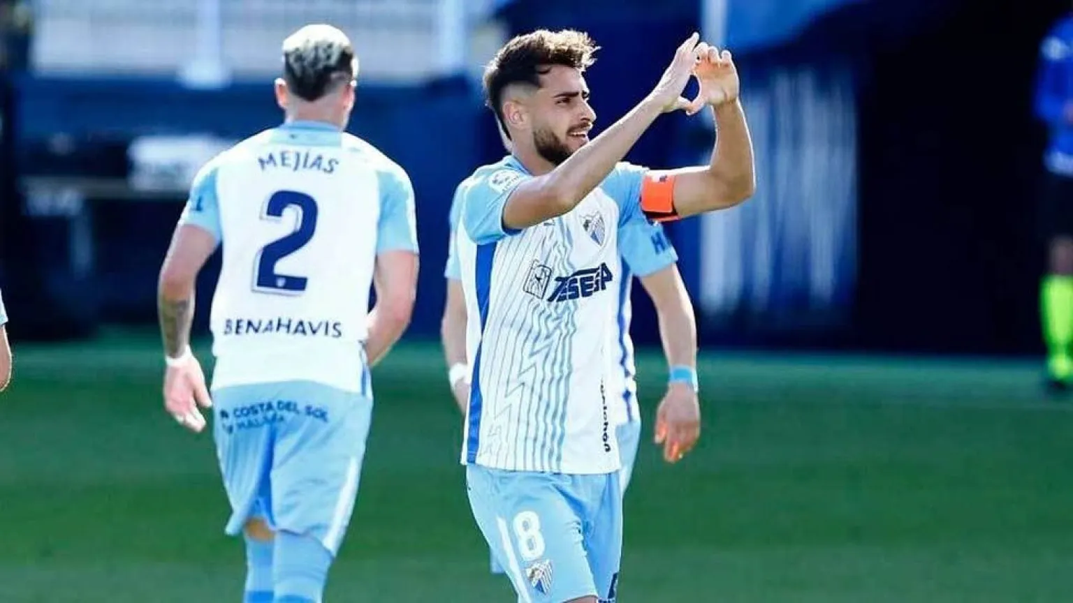 Luis Muñoz en uno de sus goles del pasado año en La Rosaleda.