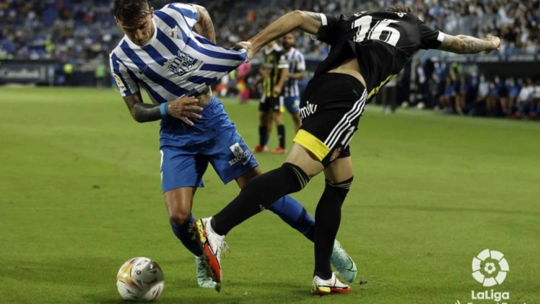 El equipo malagueño, como es habitual en su estadio, inició el partido con un ritmo endiablado, presionando la salida del balón del conjunto aragonés, que sufrió los primeros minutos, pero que empezó a enfriar la partida con dominio y toque e incluso creando alguna ocasión y llegando con relativa facilidad al área malaguista. El Málaga tenía destellos, aunque el Zaragoza, mejor posicionado, había cogido rápido el transcurrir del encuentro con acciones rápidas como el disparo de Bermejo, que repelió el guardameta Dani Martín. Los suspiros llegaban a los seguidores malaguistas, algo confiados, pero que en 10 minutos observaron que el enfrentamiento no iba a ser un paseo y el rival, a pesar de sus escasos goles, cinco, tenía materia ofensiva por explorar. Y cuando peor le pintaban las cosas al Málaga y merodeaba el área zaragocista, un centro del lateral derecho Víctor Gómez lo remató de tacón el delantero Brandon Thomas, adelantando a los malaguistas, tras revisarlo el VAR, en el minuto 29. El tanto dio mordiente al Málaga, que desatado fue a por la sentencia con balones al área con un excelente Brandon Thomas, un voluntarioso Kevin Medina y la clase de Jozabed Sánchez. Genaro dispuso del segundo y no atinó por la destreza del guardameta Álvarez, y seguidamente, el Zaragoza, que no fue golpeado, en una jugada por la derecha del delantero Narváez, con un disparo raso escorado a la derecha empató el encuentro.