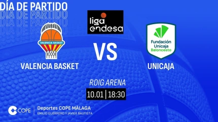 El partido Valencia Basket - Unicaja lo podrás seguir desde las 18:00 horas con la narración de Emilio Guerrero, la animación de Andrés Atienza y los comentarios técnicos de Anicet Lavodrama y Juan Carlos Bonilla en el Tiempo de Juego de COPE MÁS Málaga en los diales 97.1 FM - 882 AM y desde cualquier lugar a través de la web de COPE Málaga y en las aplicaciones de COPE y Tiempo de Juego seleccionando la emisora de COPE MÁS Málaga.