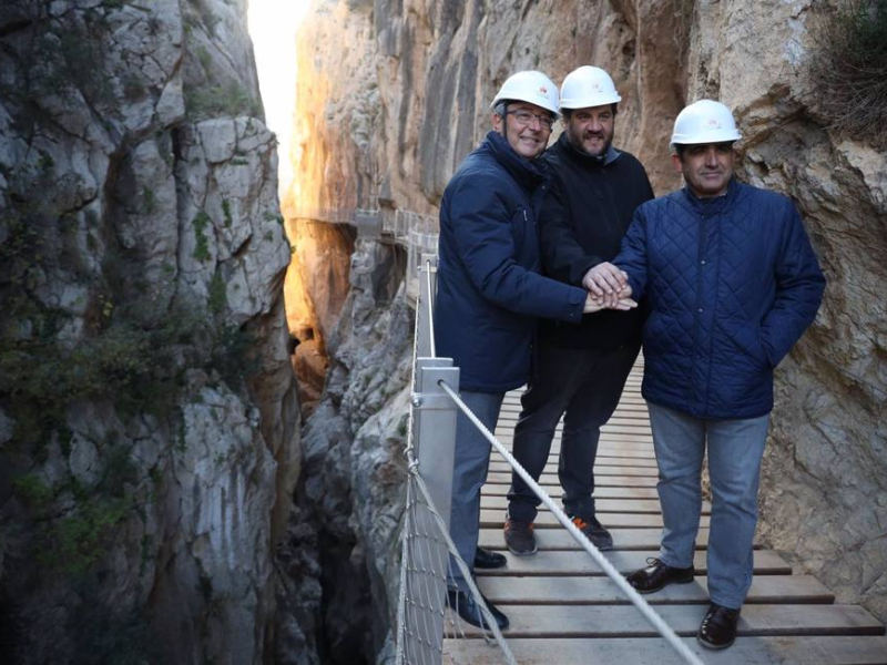 02/02/2023 El presidente de la Diputación Provincial de Málaga, Francisco Salado (i) junto al alcalde Ã?lora, Francisco MartÃnez, (d) y el alcalde de Ardales, Juan Alberto Naranjo (2d) durante la visita los trabajos de reparación y puesta en servicio de la zona del Caminito del Rey, a 2 de febrero de 2023 en Málaga, (AndalucÃa, España). Ya han concluido los trabajos de reparación y puesta en servicio de la zona del Caminito del Rey que se vio afectada por un desprendimiento en diciembre por el temporal.
