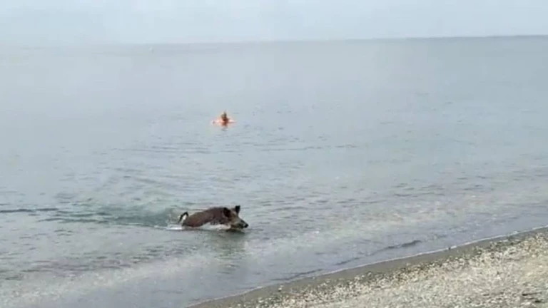 Este miércoles sobre las 12:00 del mediodía un jabalí ha sorprendido a diferentes bañistas de la playa de Benajarafe (Málaga). El animal salió del fondo del mar y llegó hasta la orilla corriendo por la arena para esconderse entre los matorrales de cañas.
