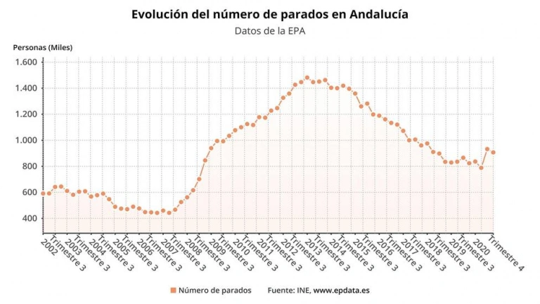 El número total de desempleados de Andalucía a final de 2020 fue de 907.200 parados, mientras que la tasa de paro se sitúa en el 22,74%, 1,94 puntos superior a la registrada en el cuatro trimestre de 2019, que fue de un 20,80%.