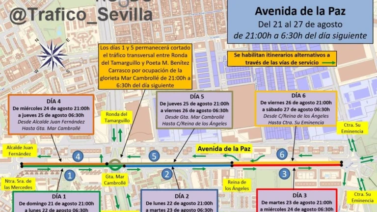 El próximo domingo 21 de agosto en horario nocturno comenzarán las obras para renovar toda la calzada de la avenida de la Paz, desde la Glorieta Víctimas del Terrorismo hasta la situada en el cruce con la Carretera Su Eminencia. Las obras, que se ejecutarán por tramos, acabarán por tanto, a primera hora del próximo sábado 27 de agosto. Así lo ha informado el Ayuntamiento de Sevilla, que se encarga de gestionar dicho proceso de renovación a través de la Gerencia de Urbanismo y Medio Ambiente en coordinación con el Distrito Sur.