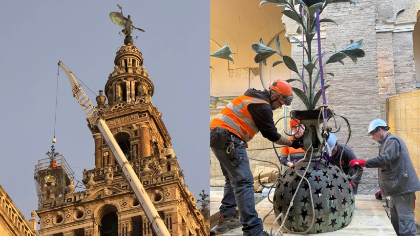 La restauración de las azucenas aportará, además, información muy valiosa para el futuro estudio del Giraldillo, ya que ambas piezas salieron de la misma fundición. El equipo de conservación aprovechará la intervención en la torre para realizar los primeros estudios sobre el estado de la emblemática veleta.