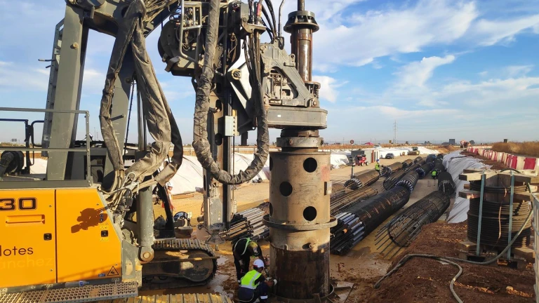 Los equipos han comenzado a perforar para colocar los 42 pilotes previstos, que tendrán 1,25 metros de diámetro y alcanzarán una profundidad de 21,5 metros. Dada la complejidad del terreno, se emplearán camisas de acero para asegurar la estabilidad durante la excavación y el posterior hormigonado de los pilotes.