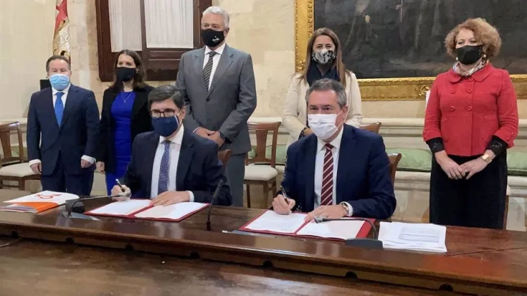 La negociación entre el Grupo Socialista y el de Ciudadanos en el Ayuntamiento de Sevilla ha llegado a buen puerto y este viernes el alcalde, Juan Espadas, y el portavoz del partido naranja , Álvaro Pimentel, han rubricado el acuerdo definitivo que permitirá que las cuentas salgan adelante.