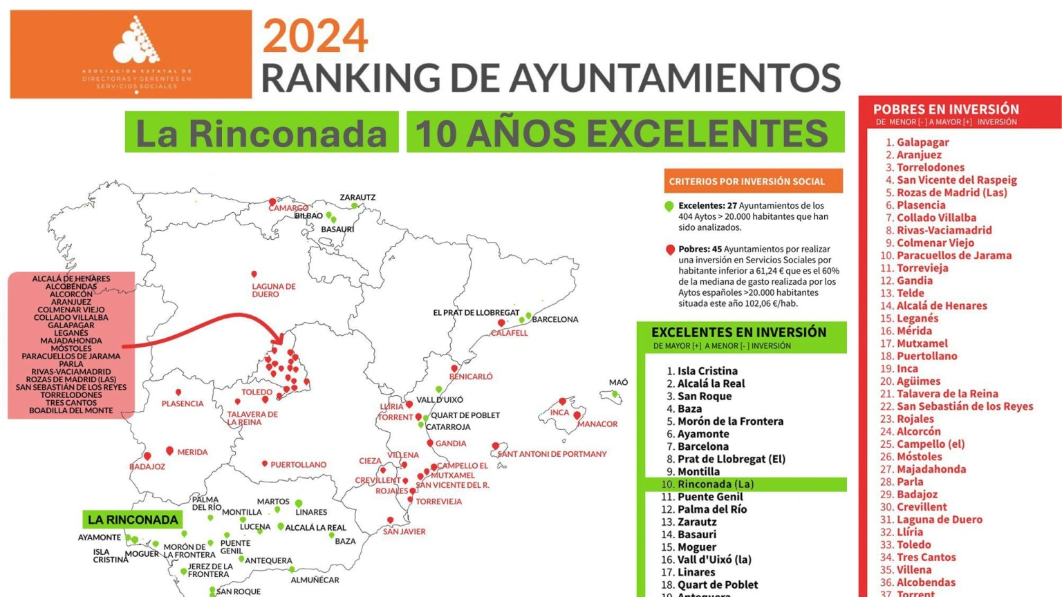 En el ámbito nacional, un total de 27 municipios españoles han obtenido la calificación de excelencia, seis más que en la edición pasada, lo que representa el 6,8 % de los ayuntamientos con más de 20.000 habitantes. Andalucía lidera la lista con dieciocho consistorios, seguida de la Comunidad Valenciana y el País Vasco con tres cada una. En la provincia de Sevilla, solo La Rinconada y Morón de la Frontera han recibido la distinción. En contraste, 45 ayuntamientos han sido catalogados como "pobres" en inversión social, concentrándose el 40 % de ellos en la Comunidad de Madrid.