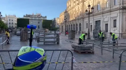 Así ha sido el inicio, en la mañana de hoy, del montaje de los palcos de la Carrera Oficial de Sevilla en este emblemático punto de la ciudad