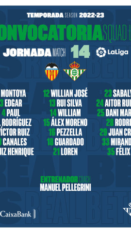 En una lista en la que están Pezzella, Guido y el canterano Felix, mientras que Bravo se cae de la lista por molestias en el soleo.
