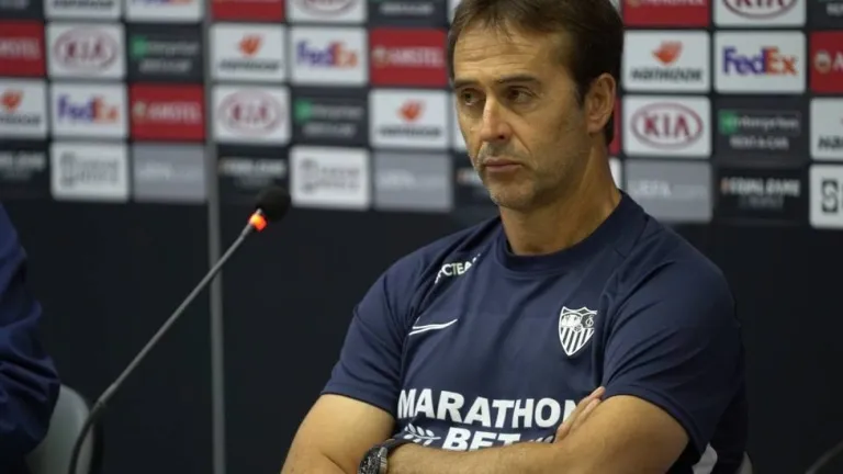 Lopetegui en la sala de prensa del Qarabag antes de debutar en la Europa League con el Sevilla