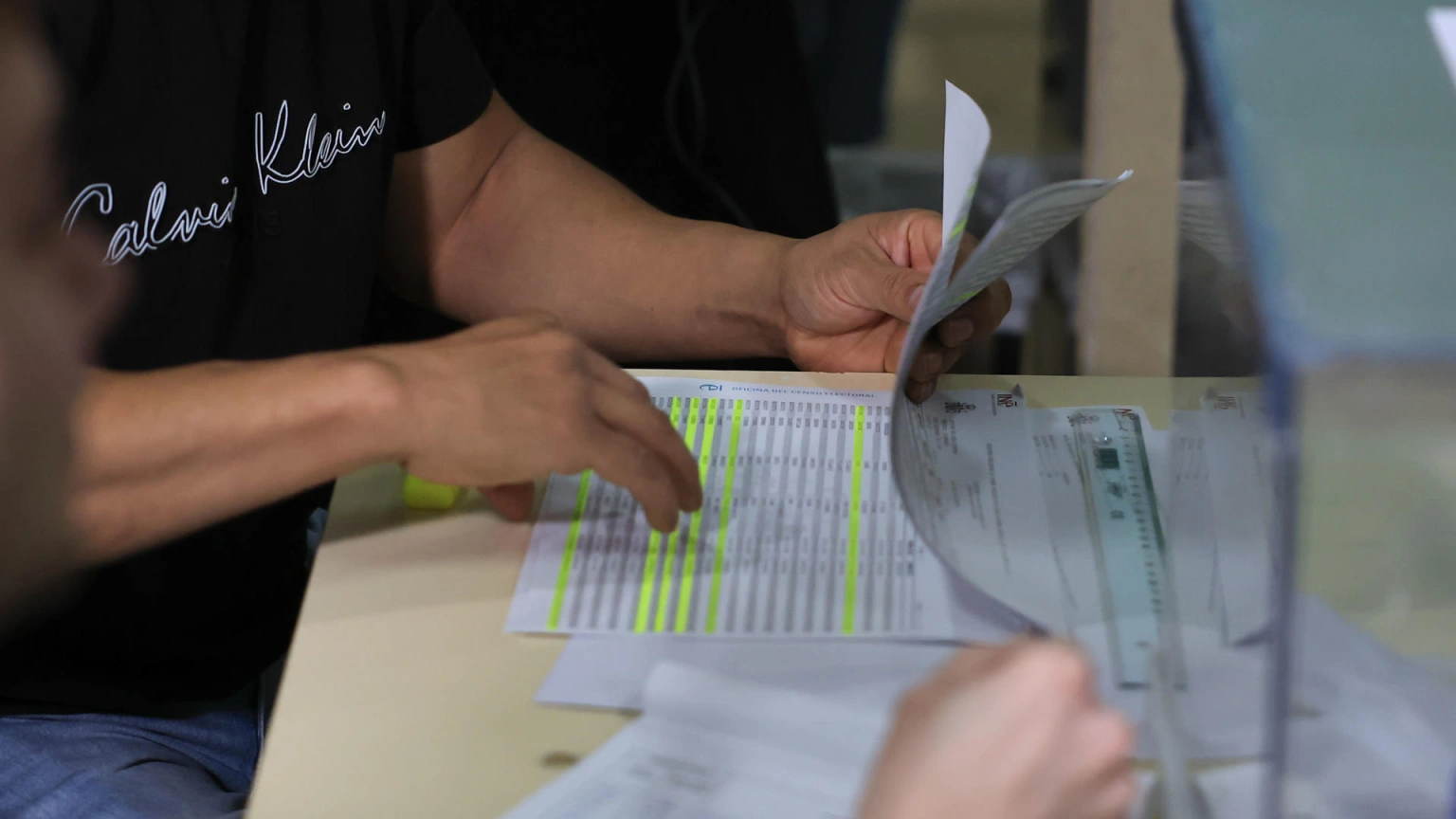 Un miembro de una mesa electoral revisa el censo de votantes en un colegio electoral este domingo en Zaragoza
