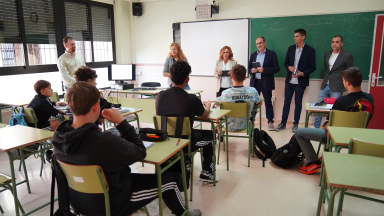 El diputado de Desarrollo de la DPH, José Cebollero, ha hecho entrega de las agendas esta mañana en el IES Montes Negros de Grañén acompañado de la directora provincial de Educación, Mónica Martínez, el jefe provincial de la unidad de Programas Educativos, Guillermo Gómez, la directora del centro, Susana Paúles, y el alcalde de la localidad, Carlos Sampériz.