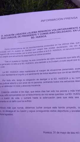 Agustín Lasaosa renuncia a sus cargos en la SD Huesca Escucha la comparecencia íntegra del nuevo consejero delegado Manolo Torres Redacción Digital