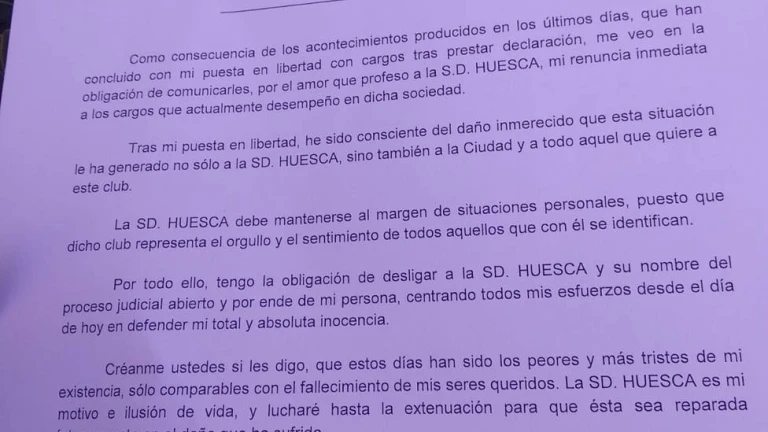 Tras celebrarse un consejo de administración extraordinario en la SD Huesca se ha comunicado que Agustín Lasaosa ha renunciado voluntariamente a sus cargos de presidente y consejero delegado de la entidad tras su imputación en el caso Oikos. El consejo ha anunciado que el abogado de la entidad Manolo Torres asumirá el cargo de consejero delegado, pero no de presidente que de momento quedará vacante.