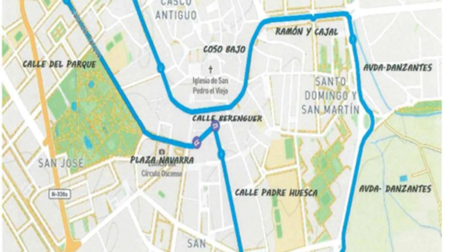 La carrera comenzará a las 10.00 horas desde el Palacio de Congresos de Huesca siguiendo por la avenida de los Danzantes, Ramón y Cajal, plaza Santo Domingo, Coso Bajo, Coso Alto, avenida Monreal, avenida de la Paz, calle del Parque, plaza Navarra, calle Berenguer, calle Padre Huesca, calle del Pintor, León Abadias, calle Teruel, avenida de los Danzantes, camino de las Cruces y llegada de nuevo al Palacio de Congresos. Se calcula que los últimos participantes lleguen a meta sobre las 11.30 horas.