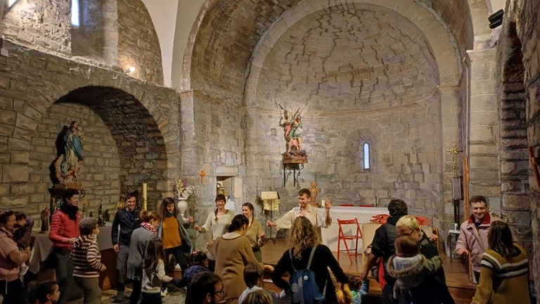 El fuerte viento ha obligado a un pequeño cambio de planes ya que estaba previsto que la acción se desarrollase en la plaza Mayor de la localidad, pero finalmente debido a estas inclemencias se ha optado por llevar la música y la danza a otra parte, al interior de la iglesia de San Miguel,