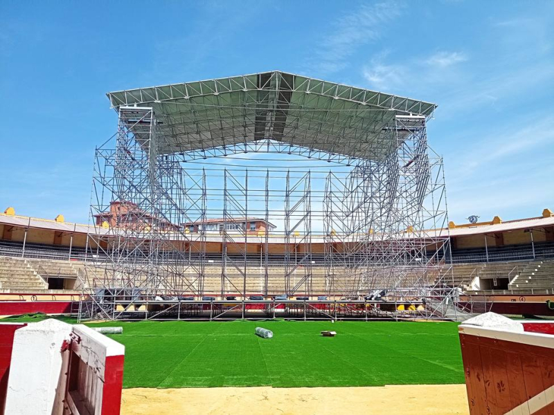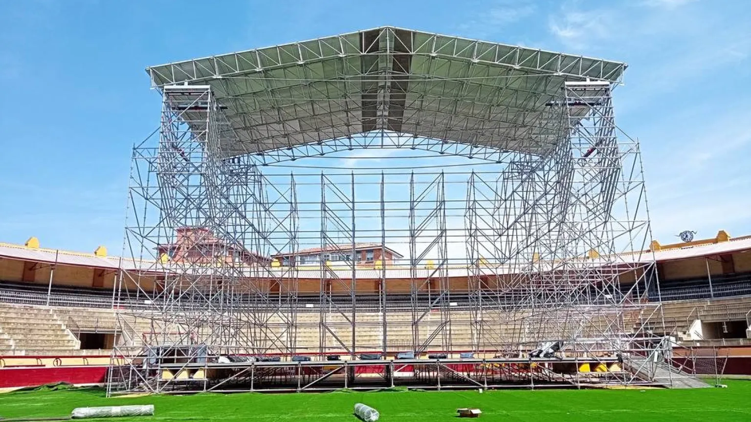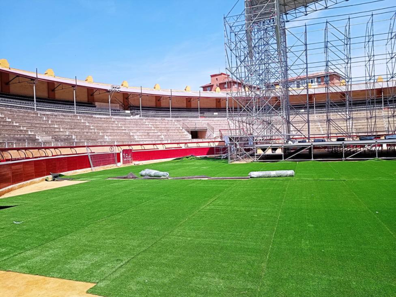 De momento, continúan los preparativos en el montaje del escenario y el espacio escénico con la colocación de césped artificial en el coso taurino para la colocación de las localidades.