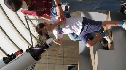 El Planetario de Aragón ha recibido hoy la visita de un grupo escolar; niños y niñas de 5 años del colegio Pedro J. Rubio de Huesca han disfrutado de los misterios del Universo, con la proyección 'La familia solar', un viaje en simulador de nave espacial y lanzamiento de cohetes en el exterior del Centro Astronómico. Esta visita escolar ha coincidido con el eclipse solar, que lo han observado desde los telescopios.