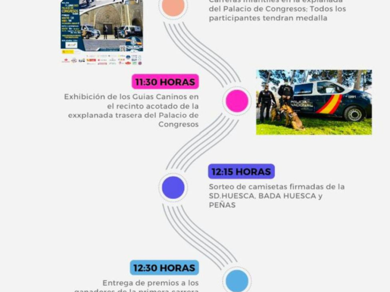 La Policía Nacional organiza por primera vez en Huesca esta carrera Solidaria que tendrá lugar mañana domingo día 11 de junio. La jornada deportiva, solidaria y lúdica consistirá en una carrera y marcha popular con una distancia de 5 kilómetros por el caso urbano de la ciudad, que se iniciará a las 10,00 horas, así como diversas carreras infantiles en la explanada del Palacio de Congresos, donde además habrá exhibición de material y demostraciones operativas de diferentes unidades de la Policía Nacional.