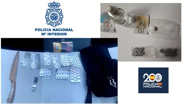 Los agentes identificaron a estos dos jóvenes, siendo ambos menores de edad, e intervinieron los objetos de los que trataban de desprenderse, tratándose de un cuchillo de grandes dimensiones y de un bolso conteniendo varios blisters con 60 comprimidos de sustancias sujetas a prescripción médica e incluidas en la tabla de sustancias prohibidas del Instituto Nacional de Toxicología.