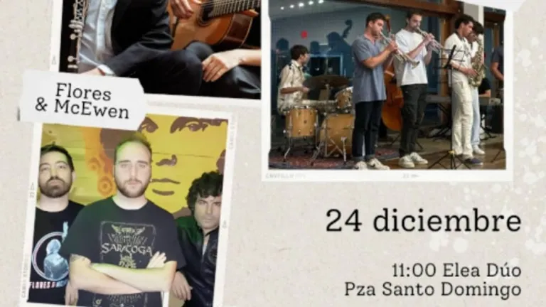 A las 11.00 horas, en la plaza Santo Domingo, el dúo de clarinete y guitarra, Elea, conectará obras de la música popular y de culto en su producción Conexiones. Será un concierto marcado por la tradición de los ritmos de raíz latina y el estilo impresionista de inicios del siglo XX con obras de Piazzolla, Albéniz, Máximo Diego Pujol o Ravel, entre otros.
