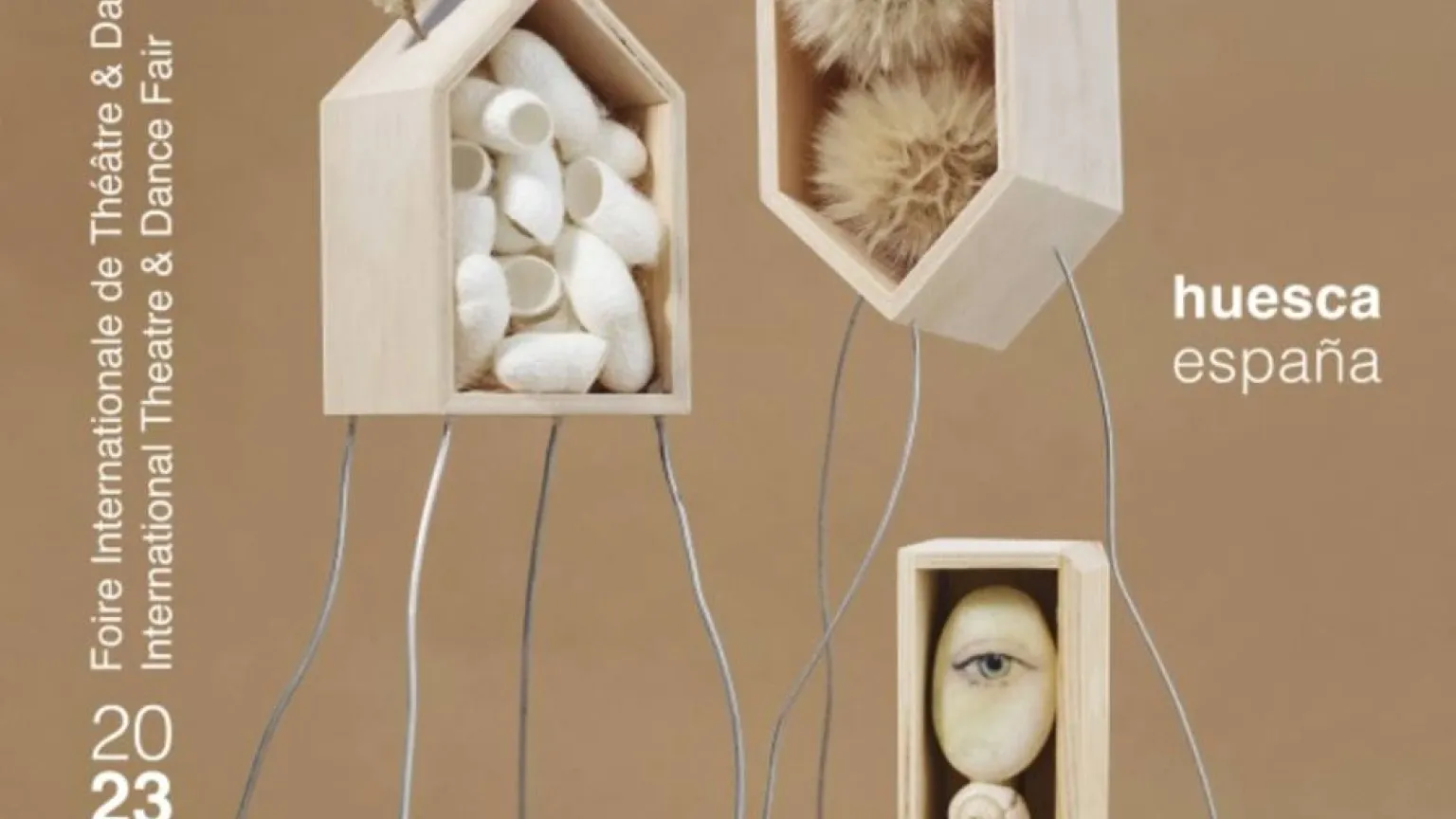 Uniendo las técnicas más habituales en su trabajo creativo, nos presenta tres “personajes”, una especie de “criaturas-nidos”, uno por cada una de las artes que veremos en la feria: teatro, danza y circo.