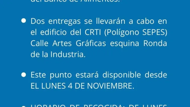 Desde este lunes 4 de noviembre se pueden trasladar los alimentos básicos para los afectados por la DANA al edificio de CRTI en el polígono SEPES.