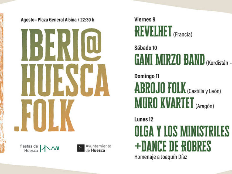 El festival iberi@huesca.folk vuelve un año más con grupos de música aragoneses, nacionales e internacionales. Todas las actuaciones tendrán lugar a partir de las 22:30 horas en la plaza General Alsina, del día 9 al 12 de agosto. Contaremos con la presencia de grupos como Revelhet, Abrojo Folk y Olga y los Ministriles, entre otros. La edición de este año se ha extendido dos días adicionales, con la actuación de varios DJ’s de música reggae y jamaicana el día 13, y de la Ronda de Boltaña el día 14 a las 20:30.