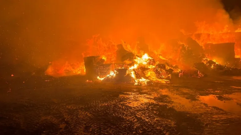 Los efectivos de bomberos de la provincia se encuentran en la zona desde esta madrugada para sofocar el fuego de unas 10.000 balas de paja que hay en el exterior