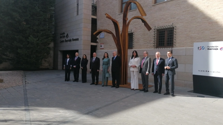 La Reina Dña. Letizia ha inaugurado la escultura el "árbol de hierro" que, de forma temporal, se ubica a las puertas del palacio Villahermosa, sede del centro social y cultural de Ibercaja, con motivo del 150 aniversario de la fundación Ibercaja. Se trata de una de las actividades organizadas en el marco del tour del talento que estos dias se celebra en Huesca.