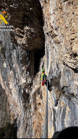 El Grupo de Rescate Especial de Intervención en Montaña (GREIM) de la Guardia Civil de Boltaña, recoge un huevo de un nido de Quebrantahuesos
